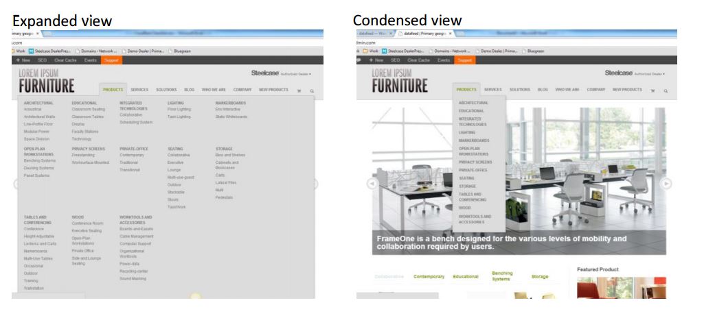 Currently the default for the Product and Solutions menus are to show an Expanded view which displays each category and its subcategory (when present) as seen below. A new feature is available that allows you to show only the condensed view for the Product or Solutions menu where only the category name is displayed and not its sub categories
